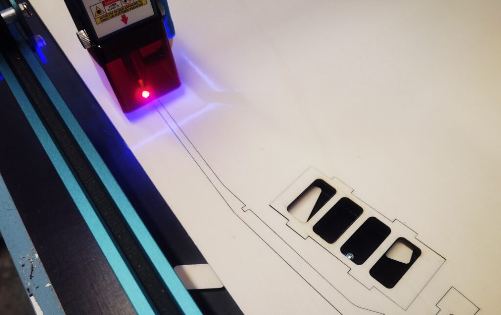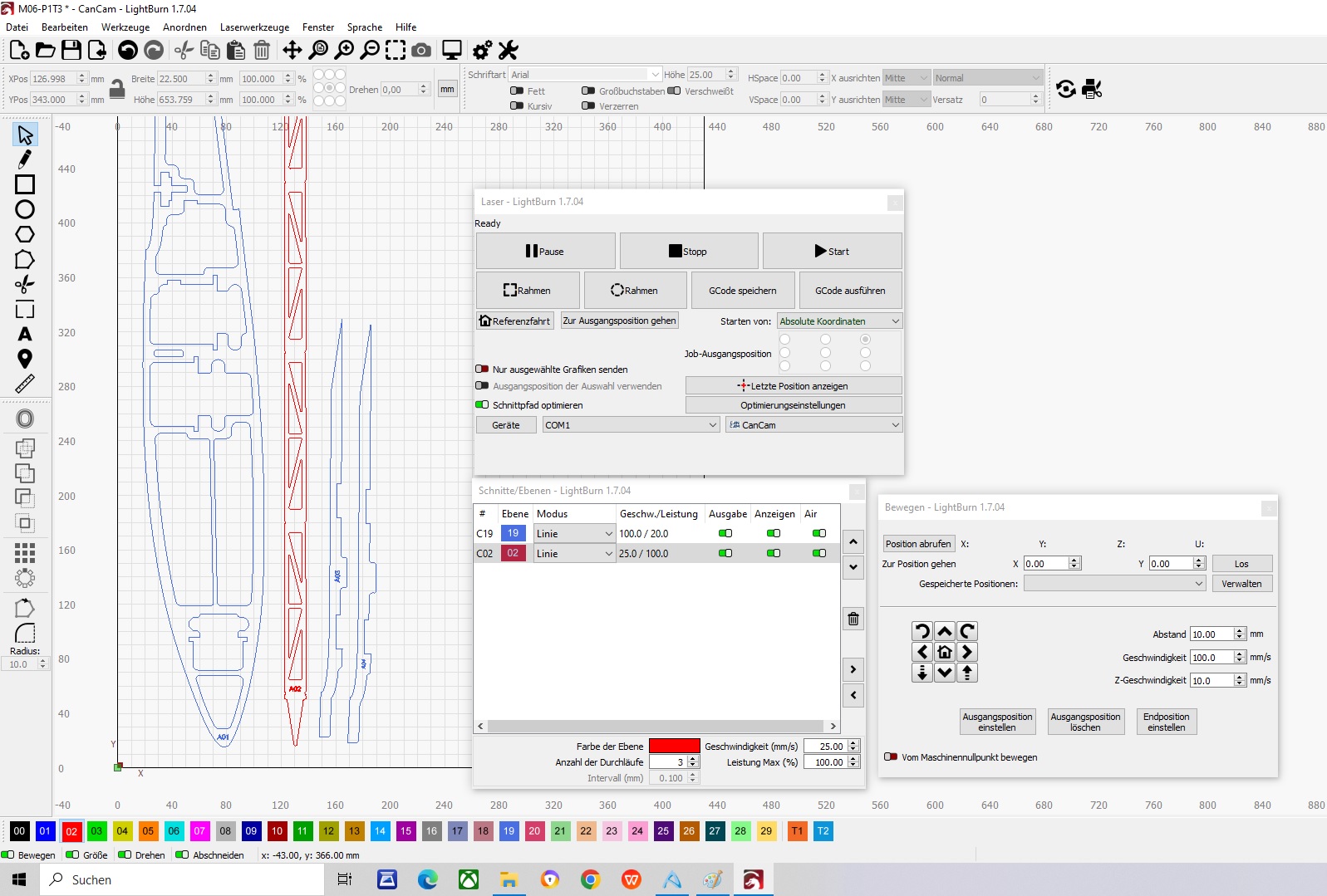 In unserem Fall werden die meisten Bauteile mit einem 10W Diodenlaser geschnitten. Als CAM Programm wird eine günstige Lizenz von LightBurn verwendet. In diesem Programm werden wenn nötig mehrere Bauteile zu Sätzen zusammengefasst und möglichst raumsparend auf die ganze Grundplatte (z.B. Balsabrett) verteilt ( geschachtelt).