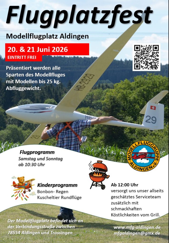 Dieses Jahr findet vom 20. bis 21. Juni wieder unser traditionelles Flugplatzfest statt. Eingeladen sind alle diejenigen, die mit uns gemeinsam dieses Fest mitgestalten möchten. Egal ob mit einfachem Trainermodell, Segler, Helikopter oder Turbinen Jet. Bei uns ist jeder willkommen, der Spaß an der Sache hat. Für Verpflegung ist natürlich wie immer bestens gesorgt.